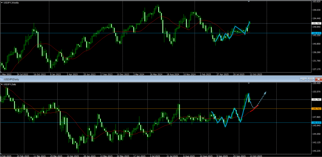 青の水平線はサポートライン(下に週足押し目買い勢力)。