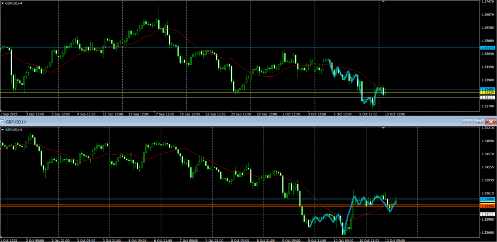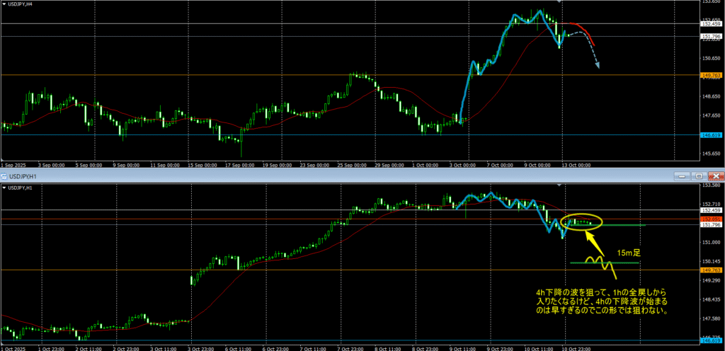 4h上昇の波を狙うなら、1hが一度下目線になって、そこから再度上目線に反転するくらいは待ちたい。