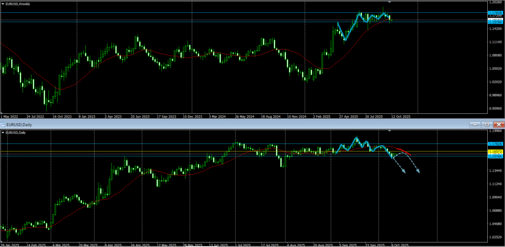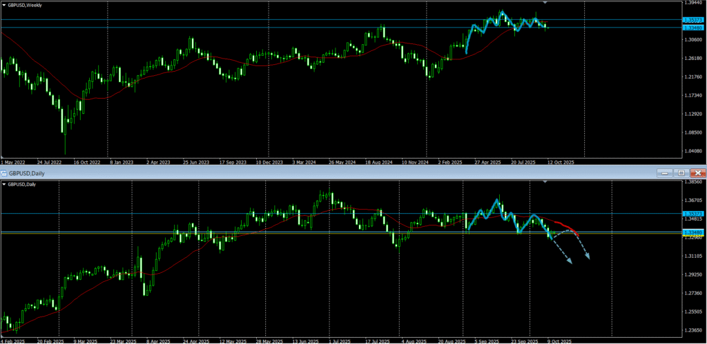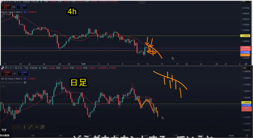 現在は下降の波の途中、もしくは4hが上方向にトレンド転換したことを考えると日足は戻りを付けてるところ。