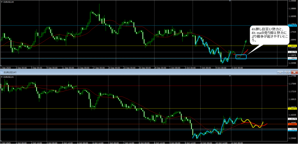 今後は4h押し目買い勢力と4hのmaの売り抑え勢力の戦争状態になりやすい。
