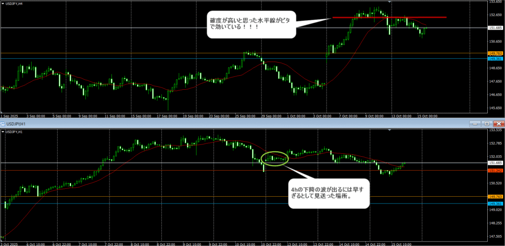 ・環境認識の時に、4hの波が出るには早いからエントリーは見送るとした判断はよかった。