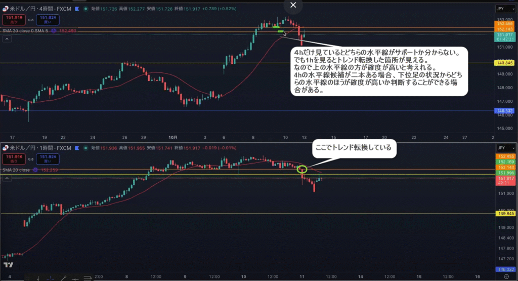 左の図は、4h戻り売り勢力がいる水平線の候補が2本ある場合。1hチャートのトレンド転換した箇所から、4hの上の水平線の方が確度が高いんじゃないかと当たりをつけることができる。