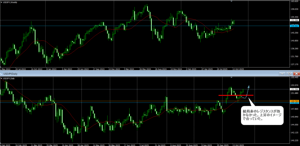 黄の水平線はサポートライン(下に日足押し目買い勢力)。