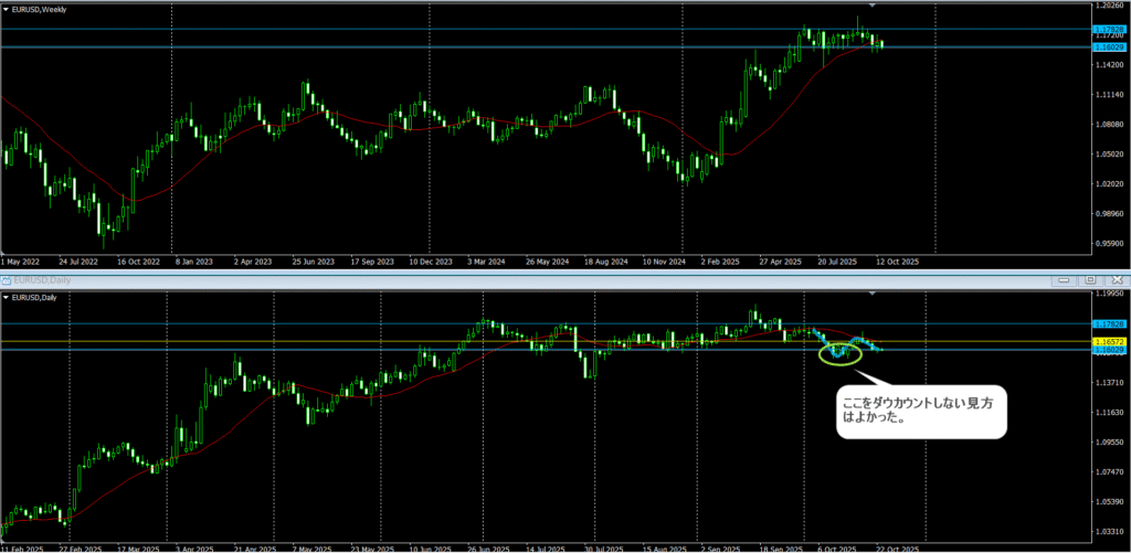 青の水平線はサポートライン(下に週足押し目買い勢力)。