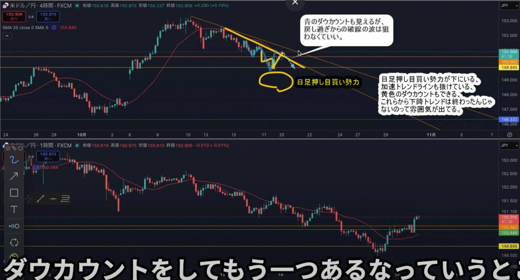 なので、破線の売りを狙うんじゃなくて、ここから日足の上昇の波に4hで乗っていくことを狙いたいという考えができる。