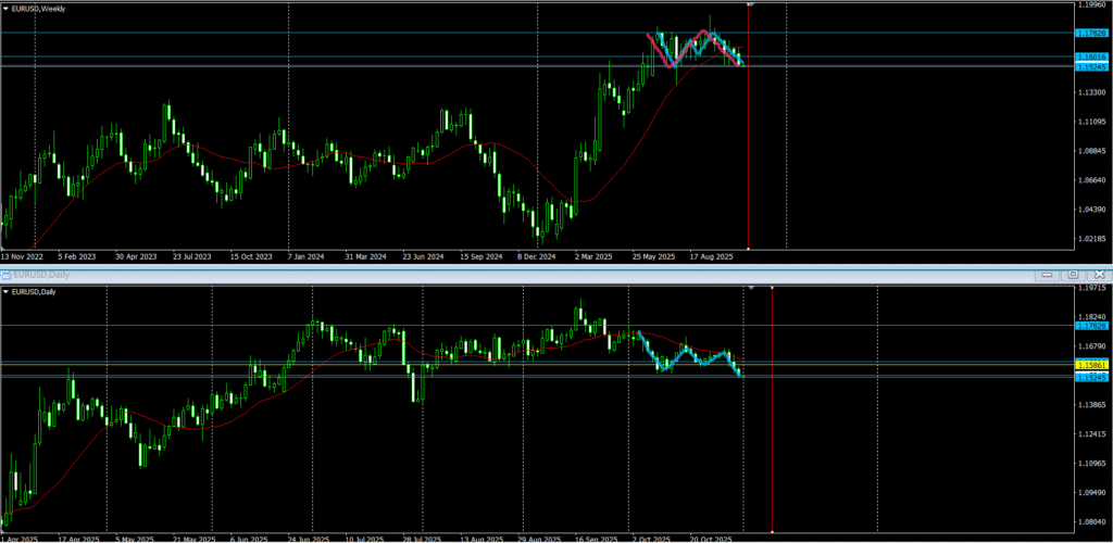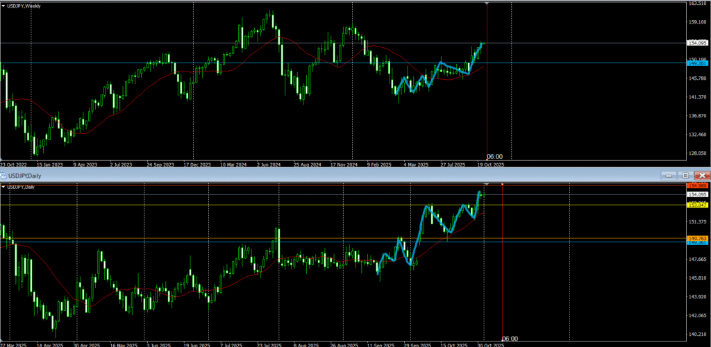 青の水平線はサポートライン(下に週足押し目買い勢力)。