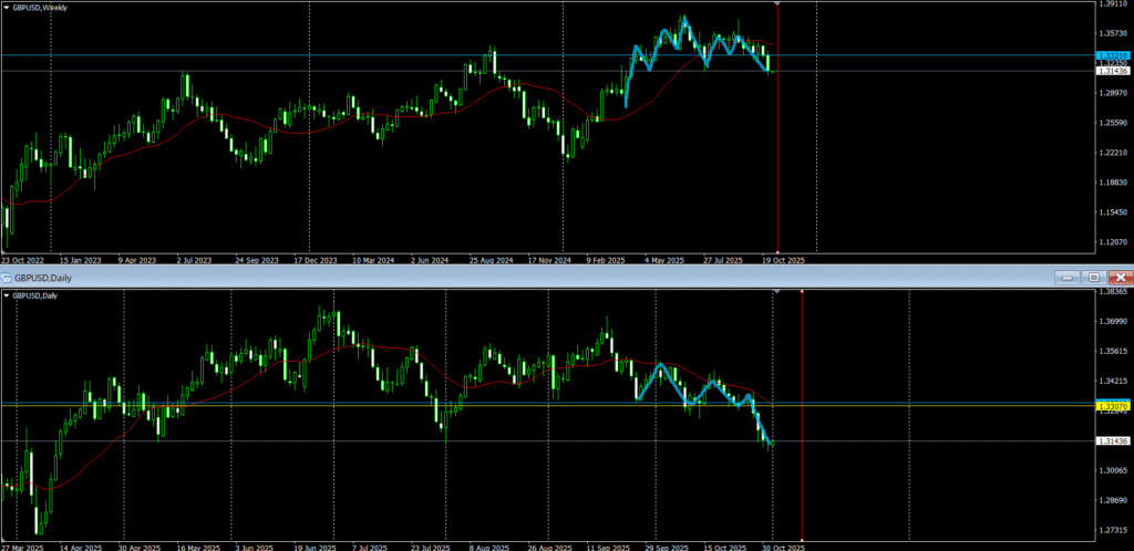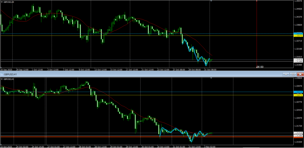 週足・日足が下降の波の途中なので、4hの売りを考えたいが、本当に波が出るか怪しく感じる。