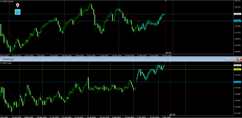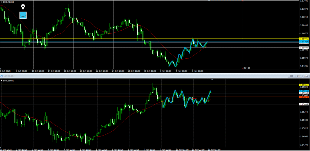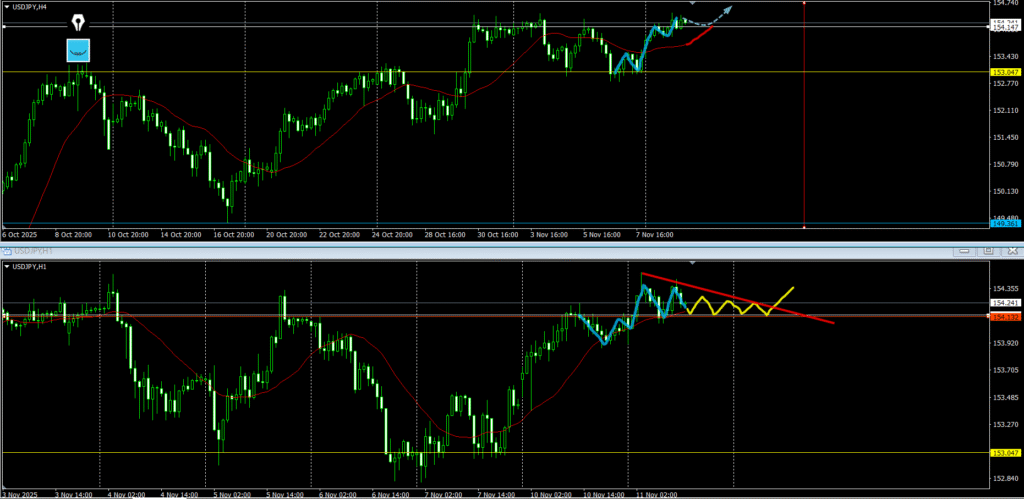 1hが攻防ラインを作り、抜けていくようであれば、4h上昇の波を狙って半ロットで買っていきたい。