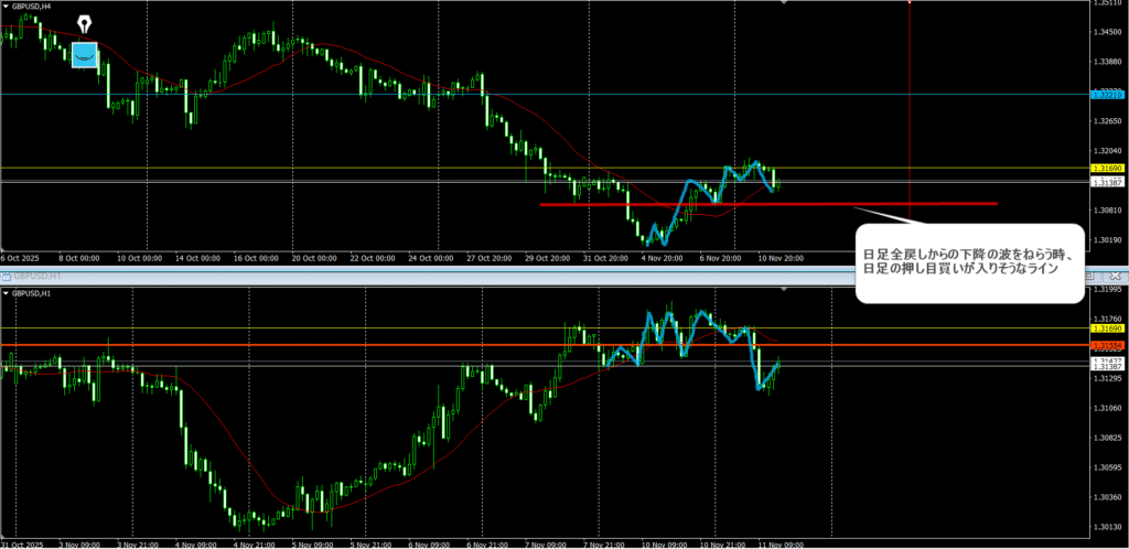 黄の水平線はサポートライン(下に日足押し目買い勢力)。