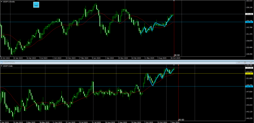 青の水平線はサポートライン(下に週足押し目買い勢力)。