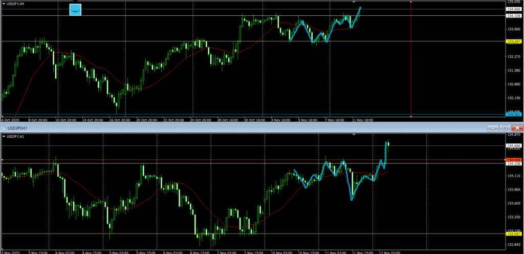 黄の水平線はサポートライン(下に日足押し目買い勢力)。