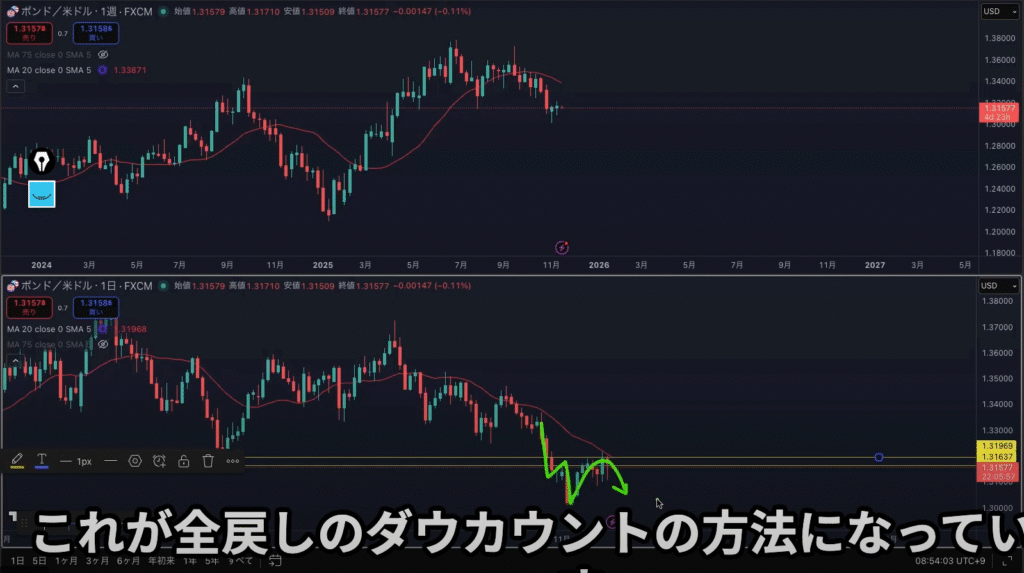 ・日足のダウカウントだが、全戻しとは見れていなかった。