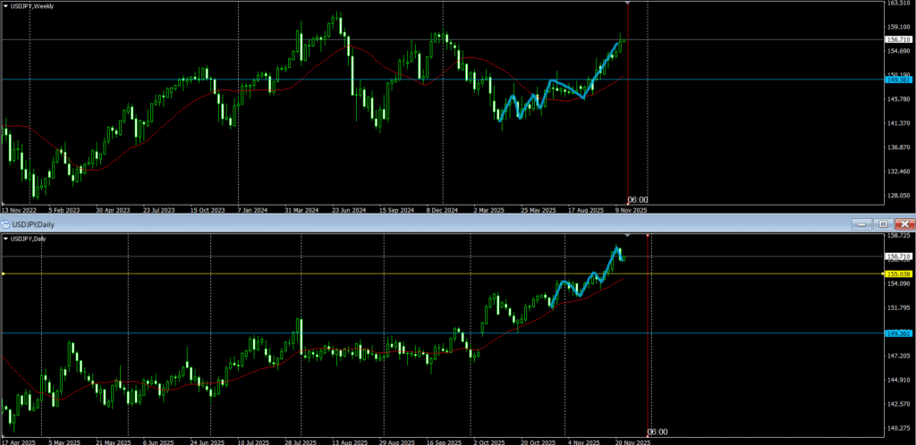 青の水平線はサポートライン(下に週足押し目買い勢力)。