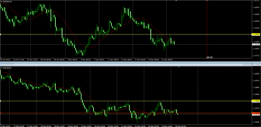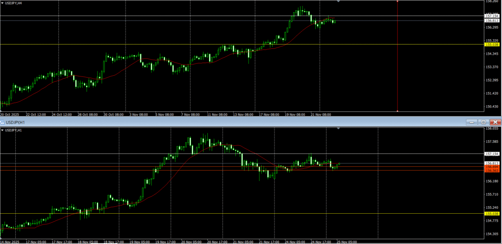 これは1hで下降の資金が入ってきた大陰線の始値に引いている。