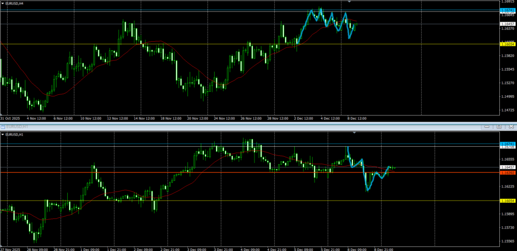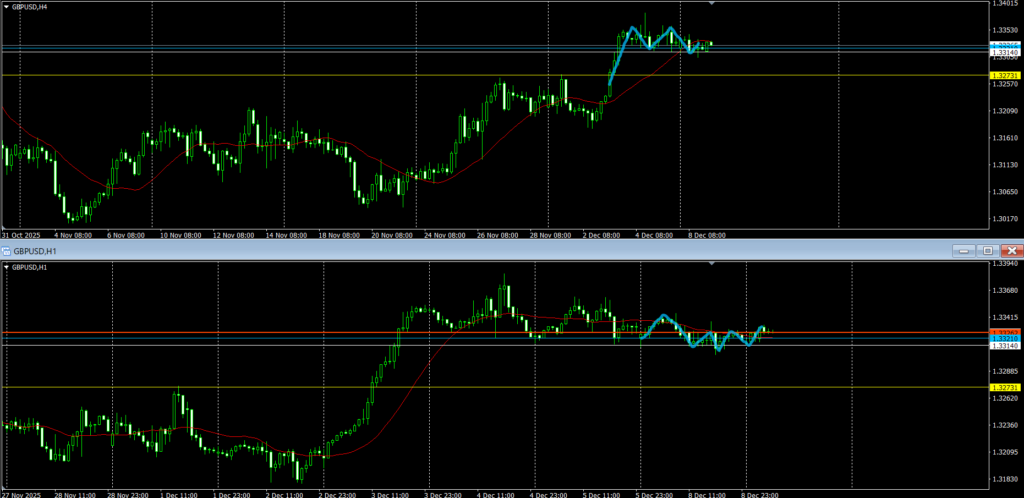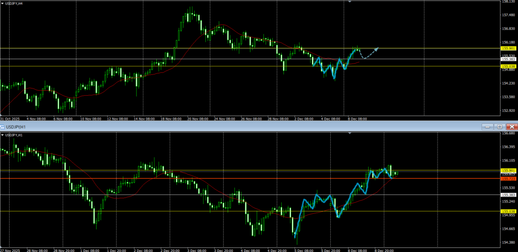 4hの動きを見ると、週足売り抑えと日足押し目買いの間で争いが起きているように見える。