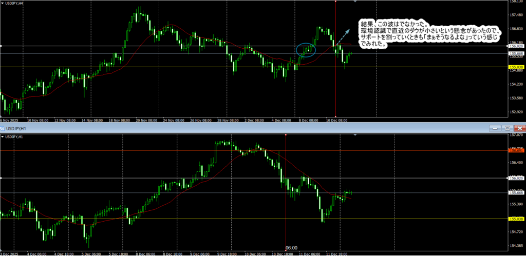 環境認識の時に直近のダウが小さいという懸念が既にあったので、サポートを割っていくときも「まぁ、そうなるよな」っていう感じで冷静に見れた。