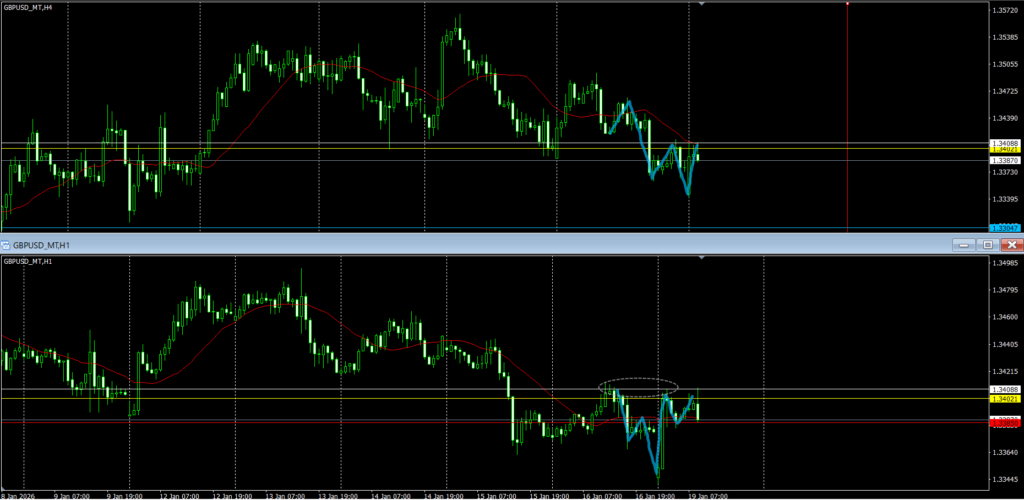 赤の水平線はレジスタンス(上に1h戻り売り勢力)