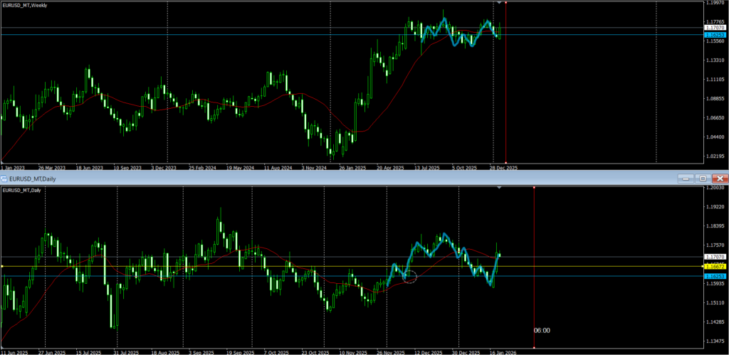 青の水平線はサポートライン(下に週足買い支え勢力)。
