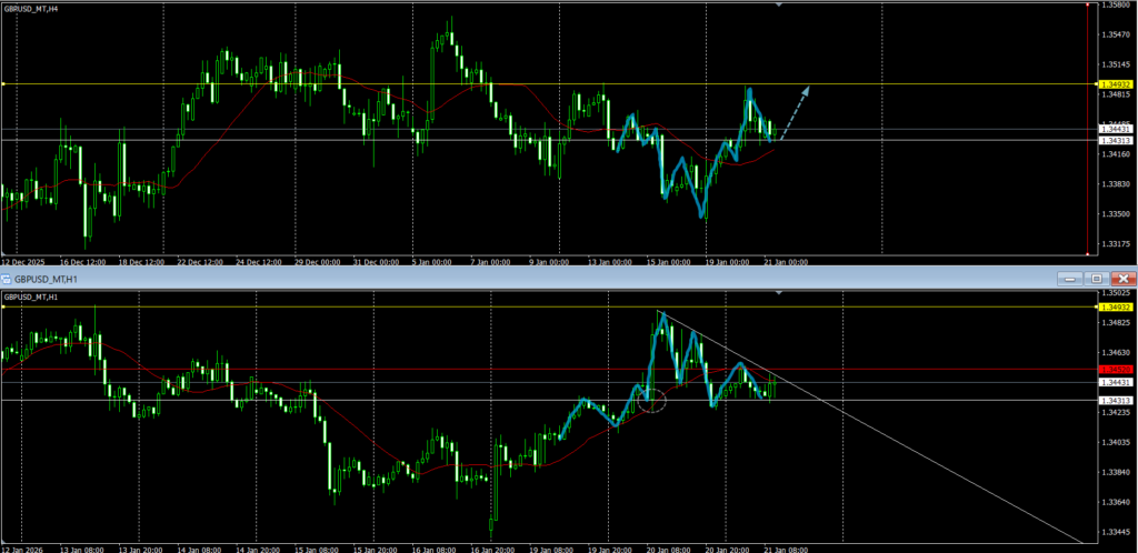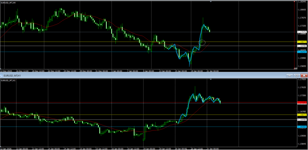 赤の水平線はレジスタンス(上に1h売り抑え勢力)。