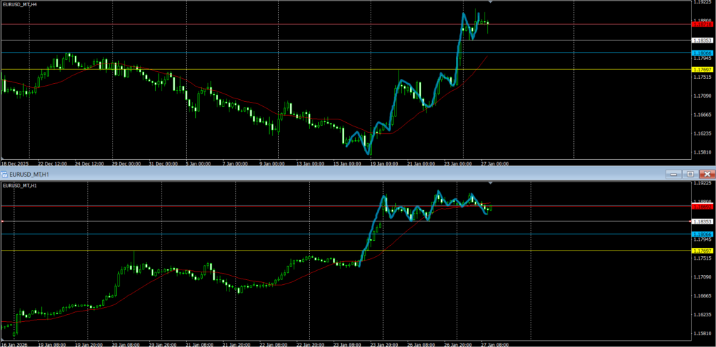 赤の水平線はレジスタンス(上に1h戻り売り勢力)