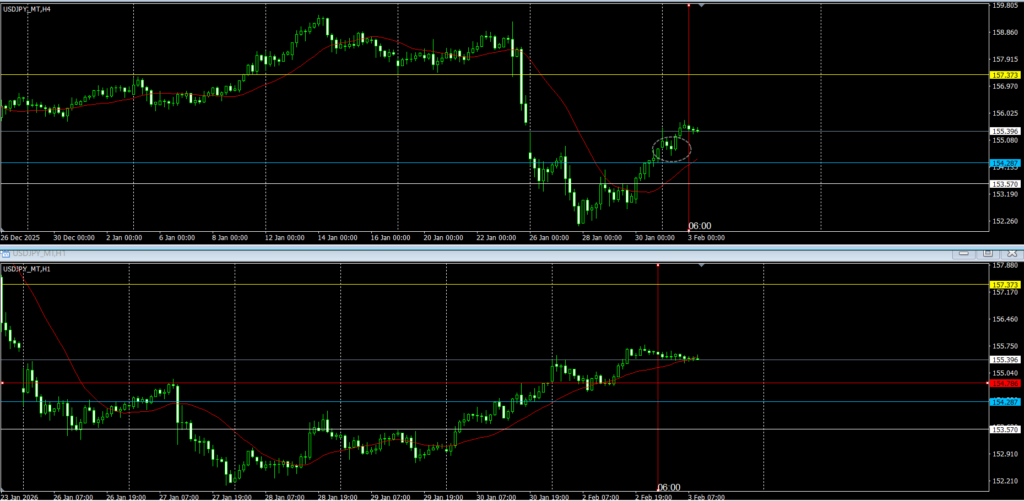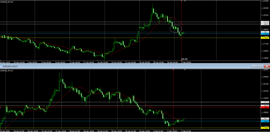 上:4hトレンド転換足の実体、下:前回安値ヒゲ先